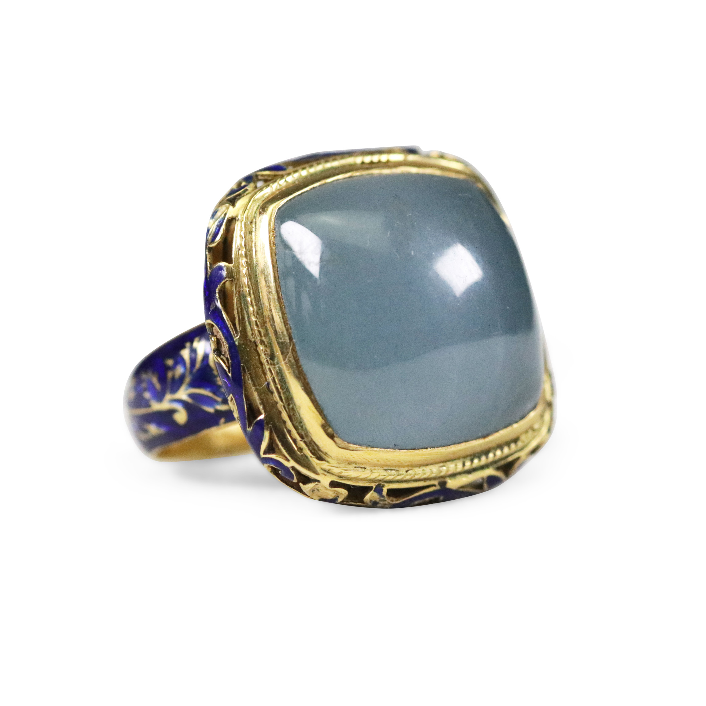 AQUAMARINE, DIAMOND AND BLACK ENAMEL RING